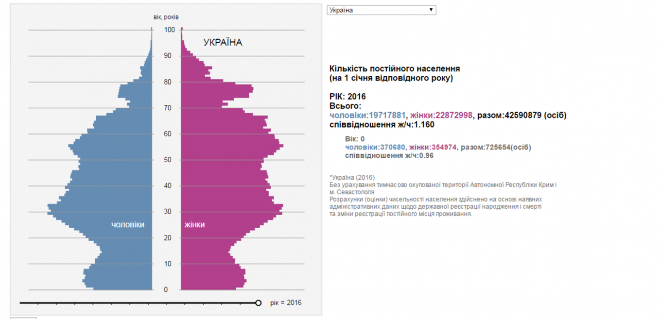Ситуация неприятная и, если пользоваться простой логикой, когда не хватает денег – начинаешь экономить. Правительство наоборот заявляет о повышении пенсий. Возможно дело в том, что изменится структура уплаты налогов и есть какие-то факторы, в корне меняющие ситуацию, о которых мы не знаем? Давайте разбираться. Для начала дам картинку — это возраст-половая пирамида населения Украины по состоянию на 2016 год. Укрстат утверждает, что не учтены города и веси Крыма.