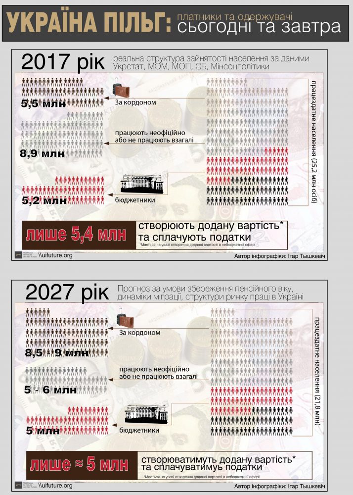 Это, повторю, оптимистический сценарий. Даже в нём 5,4 официальных работников содержат тружеников бюджетной сферы и (уже вместе с бюджетниками) платят пенсии 11,9 миллионам пенсионеров. Если трезво оценивать масштабы миграции, то становится очевидной несостоятельность сказки о «выводе зарплат из тени» как панацее от всех бед. По оптимистическому сценарию «теневой резерв» составляет от 8 до 9 миллионов. В реальности, если отбросить учитываемые Укрстатом данные по ОРДЛО и взять реальные цифры миграции в 8 и более миллионов (одна только Польша выдала 2 миллиона разрешений на работу в 2015-16 годах), то «теневой резерв» составляет всего лишь 5-6 миллионов трудоспособного населения. Из которого часть инвалиды, часть домохозяйки. Но даже если все они выйдут на работу и будут платить налоги, сегодняшнее соотношение работник/пенсионер будет далеко от оптимального 2/1, а в 2027 году при самых оптимистических расчётах работников (со всеми допущениями) будет меньше, чем пенсионеров.
