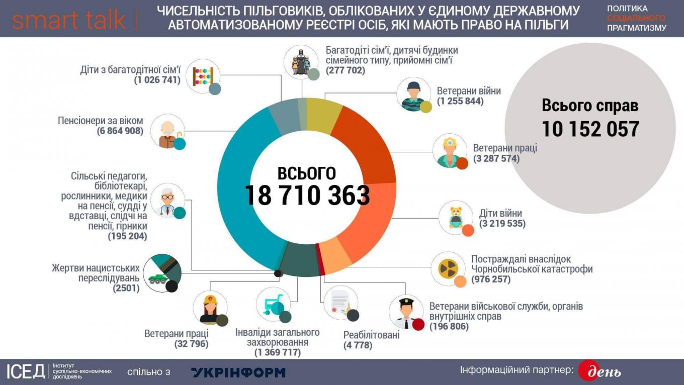Теперь порассуждаем над темой льгот. Это всё начиная от бесплатного проезда и заканчивая надбавками к зарплате, пенсии. В Украине по состоянию на март 2017 года было ни много ни мало 18 710 363 льготника. Всего личных дел на учёте в едином регистре граждан, имеющих права на льготы 10 152 057. Разница объясняется просто — некоторые граждане имеют право сразу на несколько типов льгот (то есть учитываются, например, как пострадавшие в результате аварии на ЧАЭС и, например, ветераны труда). Вот инфографика от Укринформа: