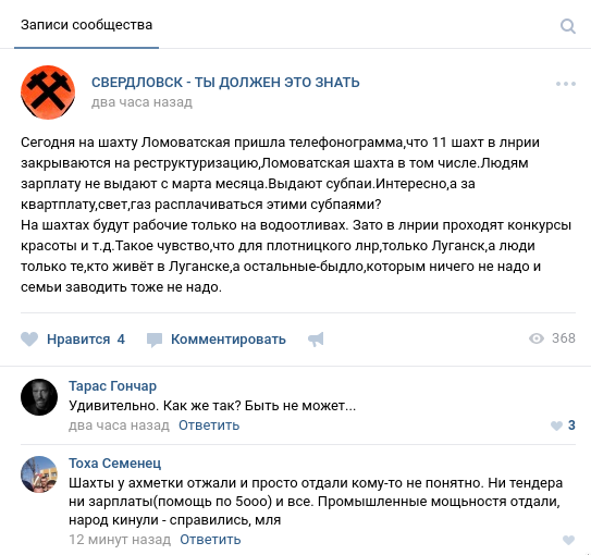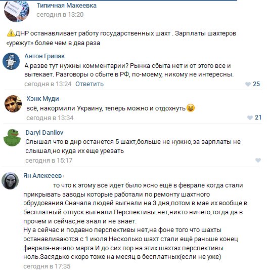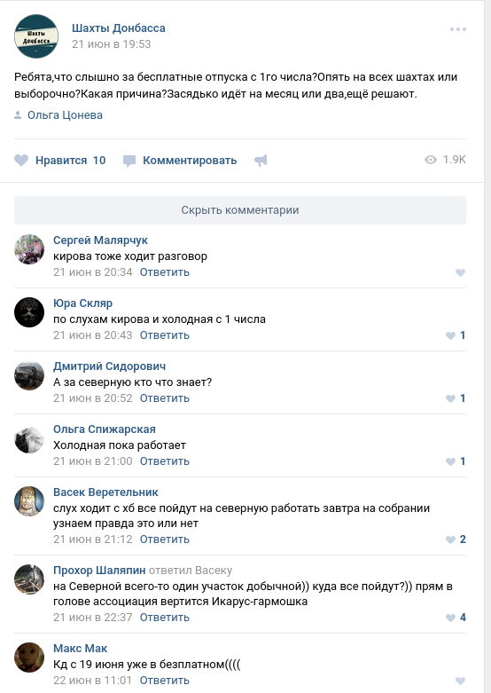 В группе «Шахты Донбасса» рабочие шахт Макеевки пишут, что с 1 июля почти все шахты отправляют в бесплатные отпуска.