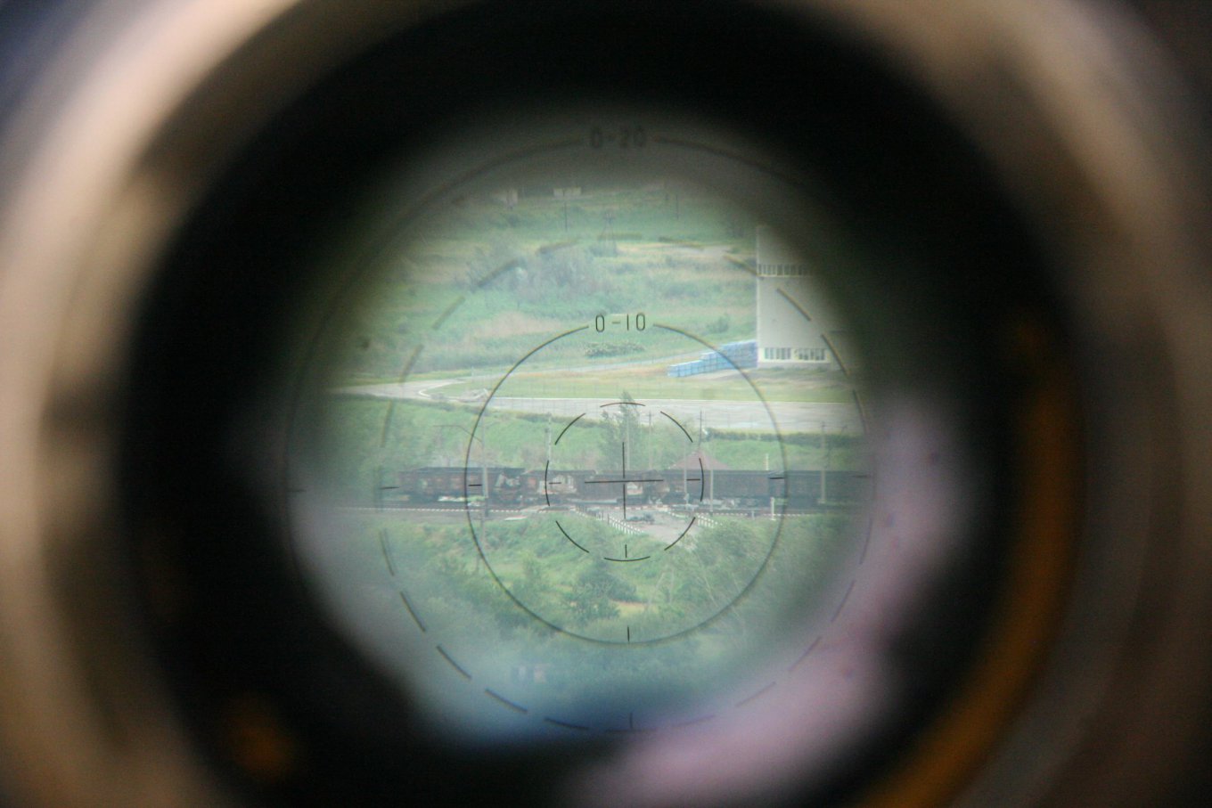 Вот фотография поезда в артиллерийскую буссоль. Поезд видно уже лучше, можно даже будет различить отдельных людей, но определить, что они - именно журналисты - по прежнему невозможно.