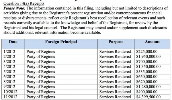 Манафорт подав документи, згідно з якими в 2012-2014 роках він працював на Партію регіонів, яка оцінила його послуги протягом двох років в 17 мільйонів доларів. При цьому Манафорт стверджує, що отримав останні півмільйона доларів від Януковича за місяць до кровопролиття на Майдані, в січні 2014 року.