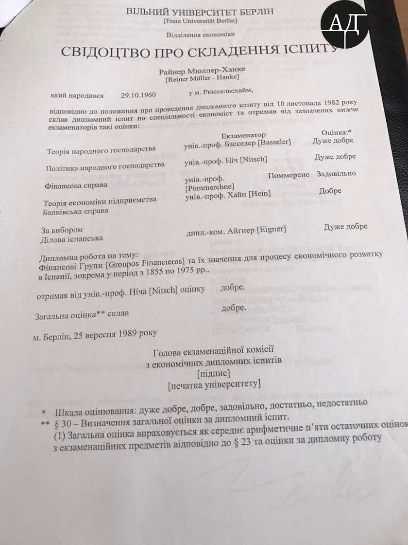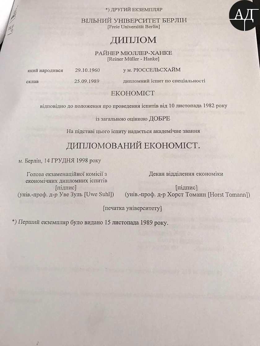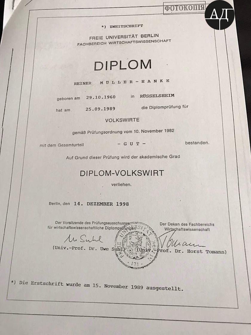 Райнер Мюллер-Ханке, которого двигает на пост главы ПриватБанка министр финансов Данилюк - подделал свой диплом и украл 75 млн долл?