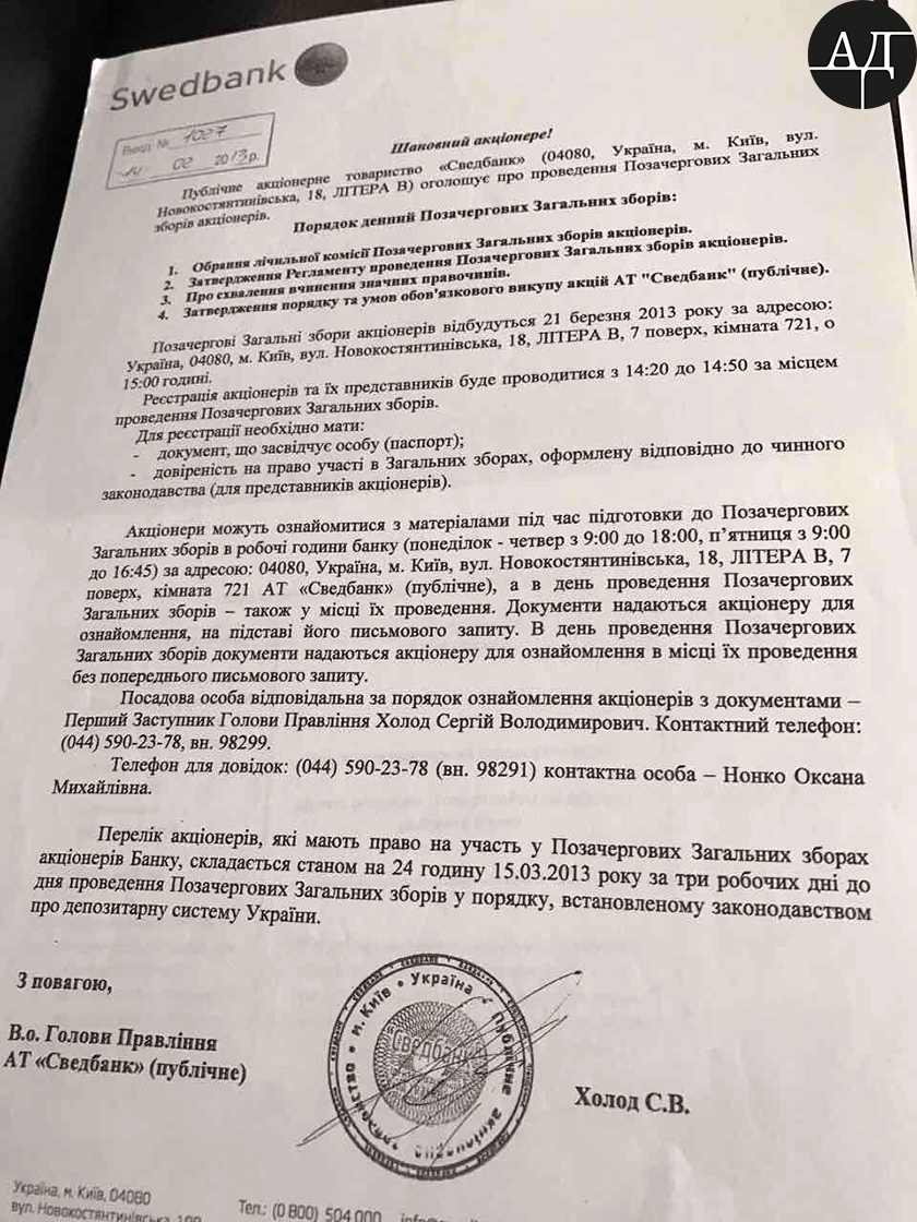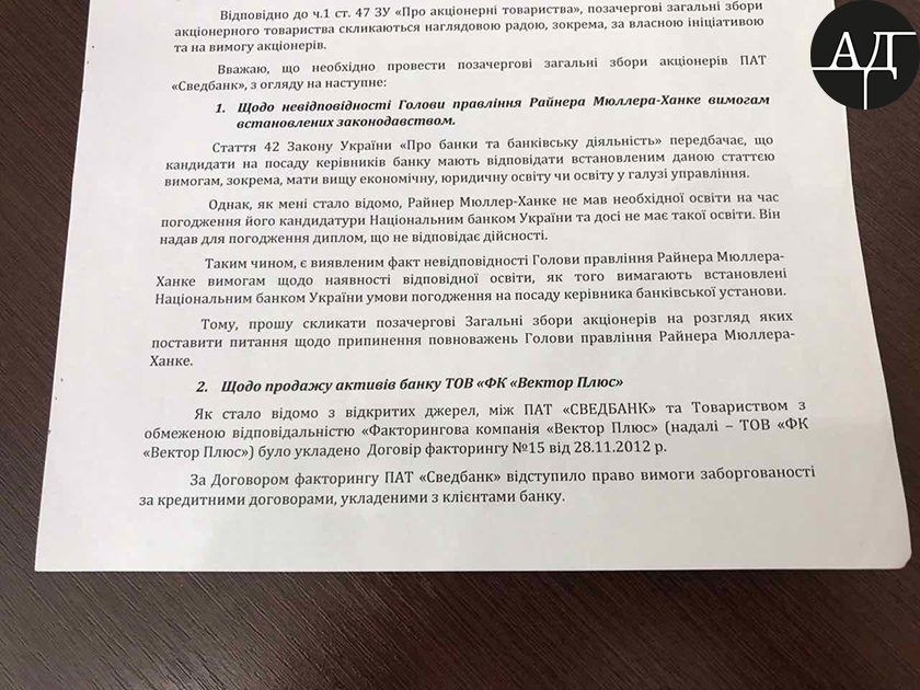Бывшие сотрудники Swedbank передали сайту dubinsky.pro повестку собрания акционеров банка, на котором обсуждался вопрос несоответствия Райнера Мюллера-Ханке должности председателя правления банка.