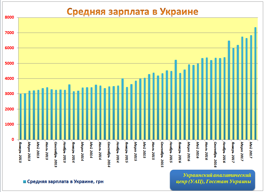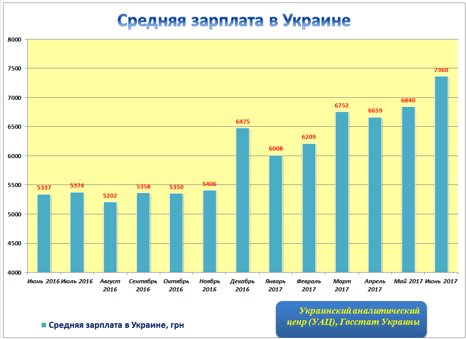 По итогам июня 2017 года средняя официальная заработная плата 7360 грн или 245 Евро. В Албании 395 Евро. Есть куда стремиться.