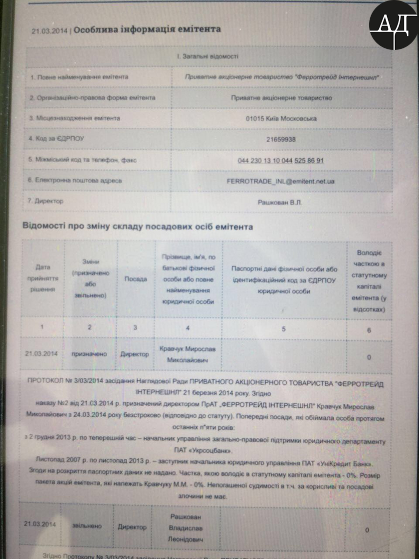 Мирослав Кравчук - бывший директор ЧАО Ферротрейд Интернешнл, которая контролируется Рашкованом (до назначения Кравчуком он сам был директором этой компании).