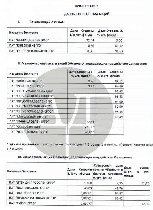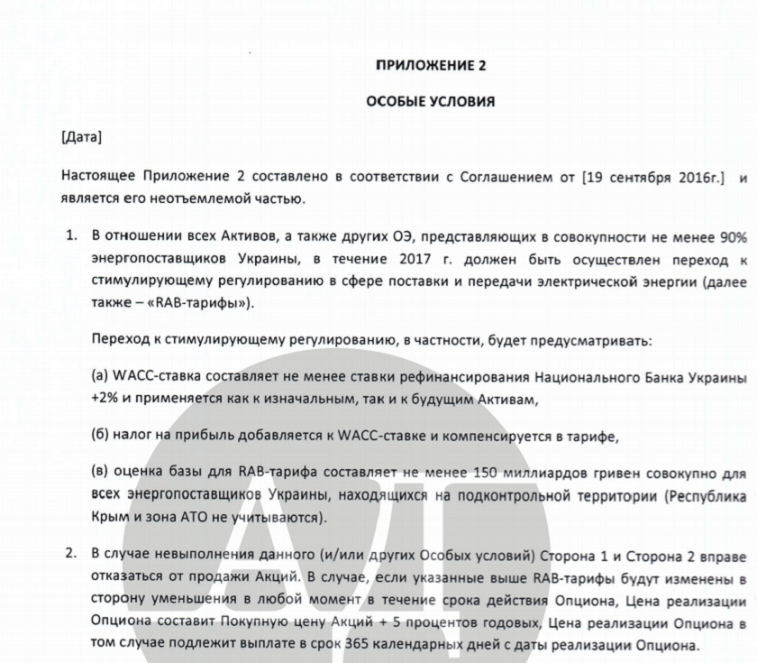 В сентябре 2016 Российские олигархи Константин Григоришин (Сторона 1), и Александр Бабаков (Сторона 2) имеющие на двоих акции в 16 (учитывая как мажоритарные так и миноритарные доли) облэнерго Украины подписали с загадочной Стороной 3 соглашение о том, что: