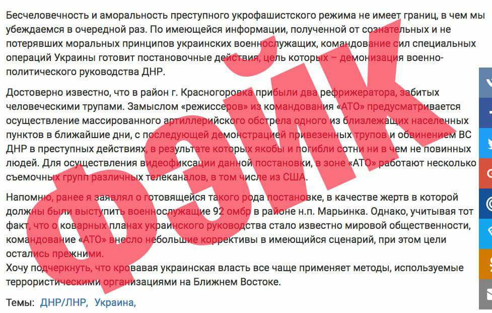 Теперь они начали розгонять новую ужастную тему. Что ВСУ ездит с рефрежираторами по зоне АТО и собираются подбросить множество трупов, для имитации обстрелов мирных жителей и населенных пунктов терористами РФ.