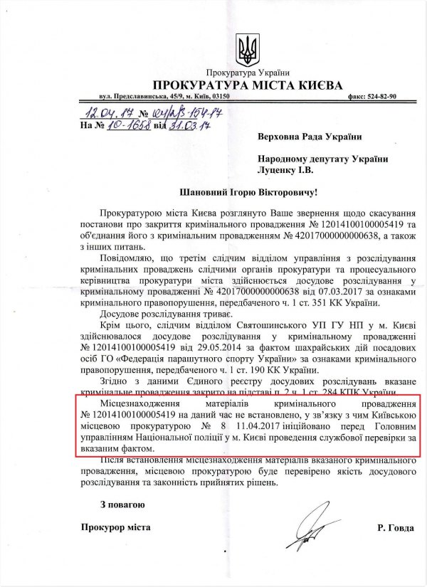 Треба думати, що прокуратура Києва також підпорядкована Авакову. Бо з березня вона не тільки нічого не робить для припинення грошових поборів чиновниками Мінмолодьспорт, але навіть не може розшукати матеріали кримінальної справи, яка була відкрита прокуратурою Києва у зв'язку з діяльністю Шаповалова в лютому 2010 року за старим КПК й внесена в 2014 року в ЄРДР за новим КПК.