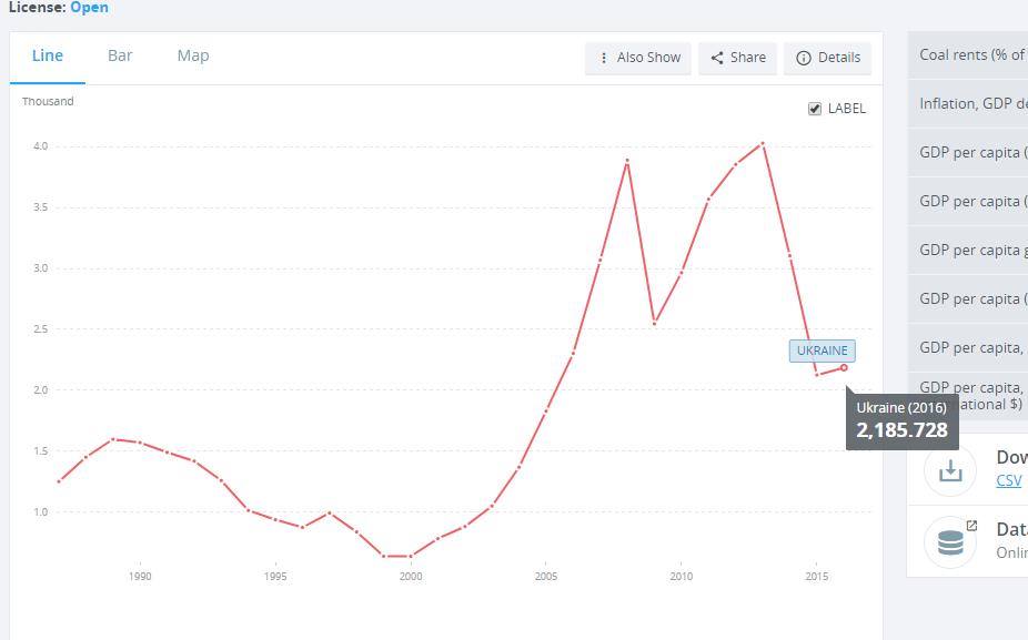 +2,5%(рост ВВП в Украине 1 квартал 2017 г к аналогичному периоду 2016 г) - после глубокого обвала 2008-2009, а также 2014-2015 годов. Почти двукратного обвала - если считать ВВП на душу в долларах(см картинку выше).