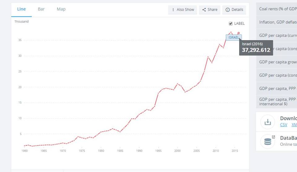 Израиль: 340 млрд долларов ВВП. В расчете на душу ВВП составляет 39 тыс долларов(оценки за 2017 год).