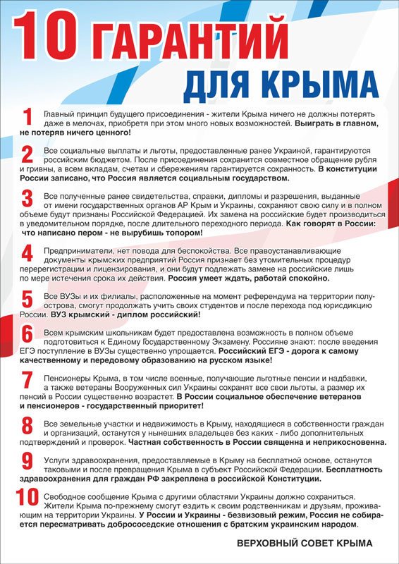 А ведь как всё красиво начиналось… Сколько обещаний оккупантами было дано предателям перед «референдумом». Могу даже напомнить. Сегодня эта листовка считается «экстремистской». Не верите? Попробуйте разместить её в Крыму на доске объявлений.