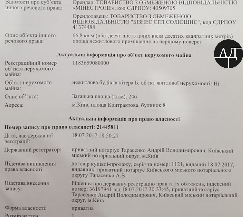 Здание по адресу Контрактовая площадь, 8 (2500 м. кв.) и здание по адресу Андреевский спуск, 2 (1250 м. кв.) - 18 июля было переоформлено на фирму "Бизнес Сити Солюшенс" (В. Стуса, 35-37).