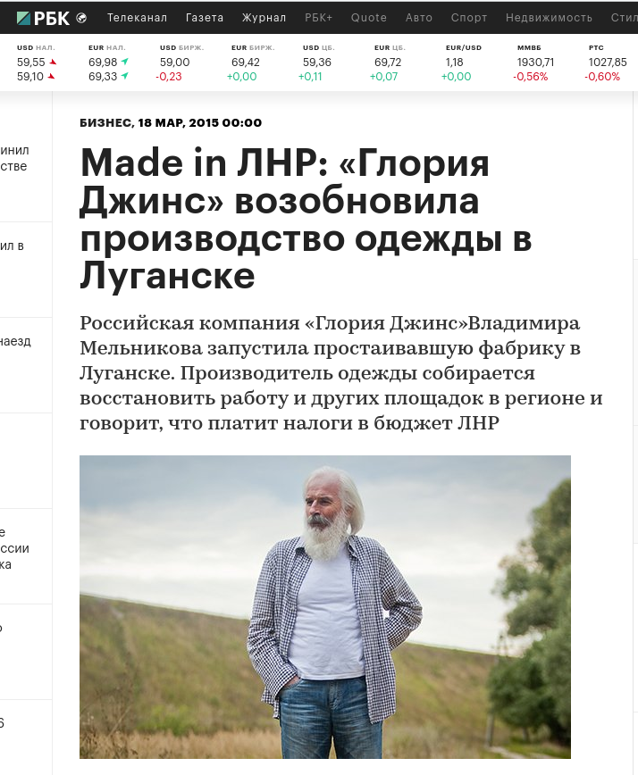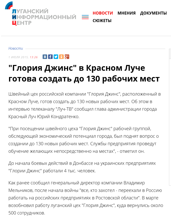 «В первых числах марта «Глория Джинс» заново запустила свою фабрику в Луганске, рассказал председатель совета директоров компании Владимир Мельников. Фабрика простаивала последние семь месяцев, сейчас, по данным Мельникова, на работу вышли примерно 500 человек из 1,7 тыс., работавших ранее. В церемонии открытия предприятия вместе с директором фабрики Натальей Донской принял участие глава самопровозглашенной Луганской народной республики (ЛНР) Игорь Плотницкий, — пишет РБК.