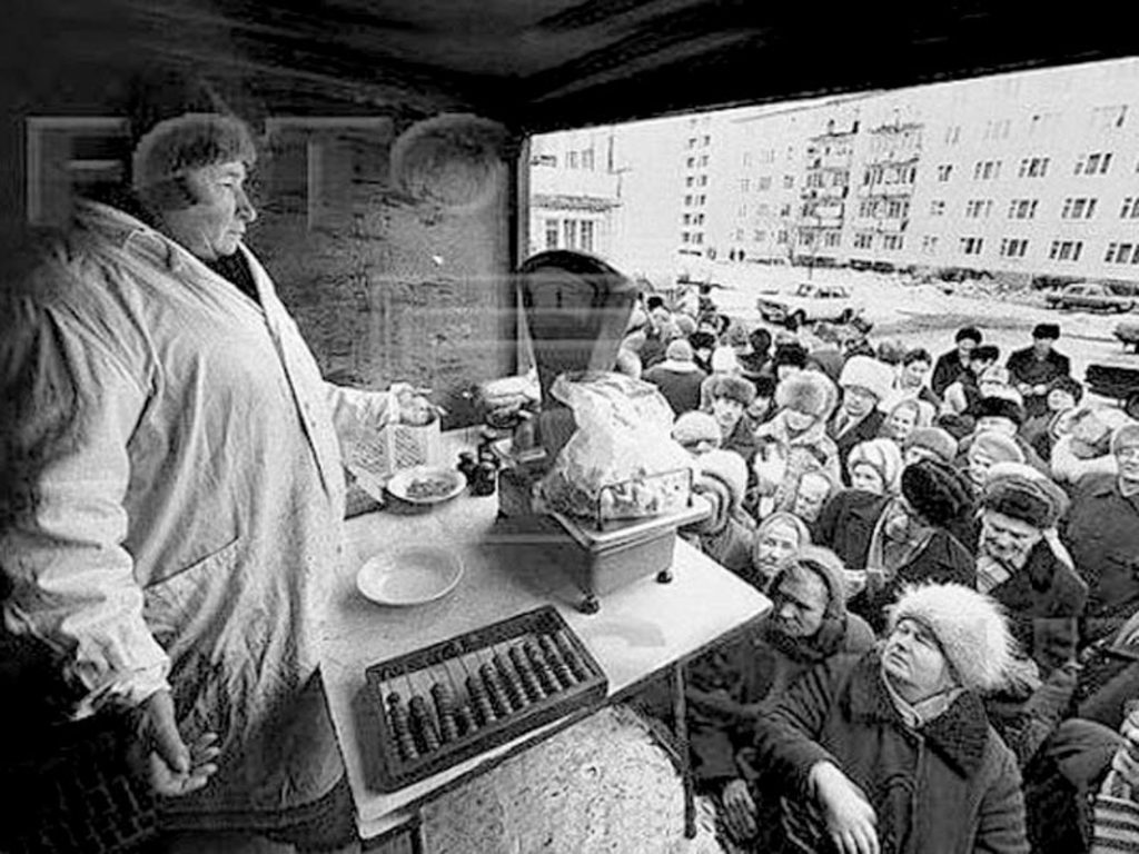 На фото — очередь в колбасном отделе. Покупатели (в основном, пожилые женщины побитого жизнью вида) выстроились за 1-2 сортами колбасы. Обратите внимание, как проходит сама торговля — покупатели не видят товара вблизи, продавщица что-то там сама отрезает и кладёт на весы — "берите-берите, а то и этого не будет!"