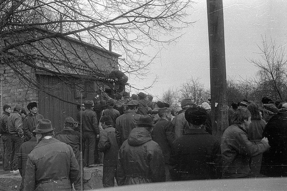 Вы можете спросить, почему в очередях продуктовых отделов заметны одни женщины, чем в это время занимались мужчины? У мужчин были свои очереди, вот например очередь за алкоголем, фотоснимок первой половины восьмидесятых годов: