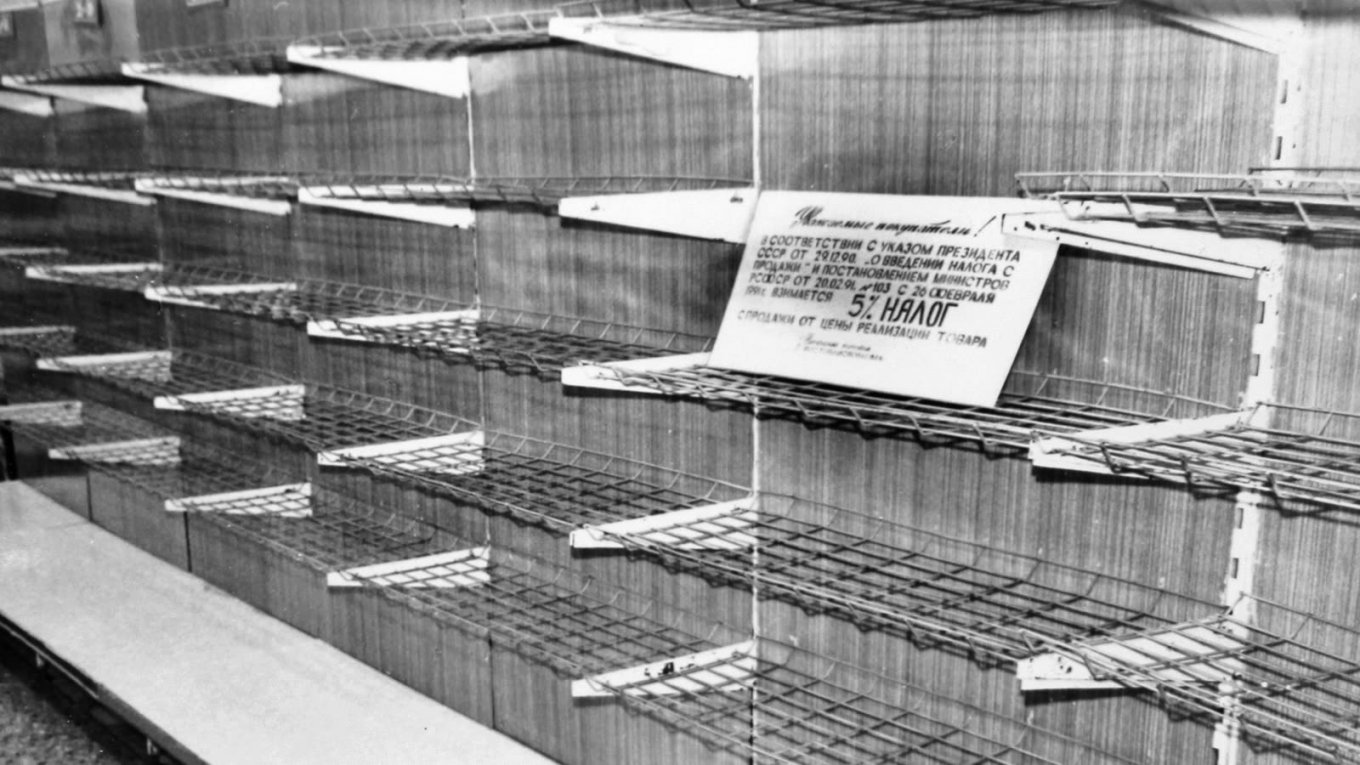 1990 год, последние месяцы существования СССР и закономерный итог "плановой экономики по-советски" — пустые полки и новые налоги.