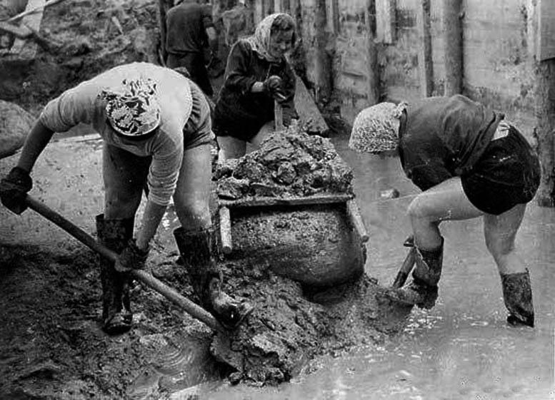 Труд советских женщин, получивших "равноправие". "В капиталистических станах женщина — всего лишь объект капиталистической эксплуатации западного империализма, и только в нашем великом социалистическом государстве женщина получила право выбора". Выбирай, короче — можешь копать лопатой, а можешь шуфлёй.