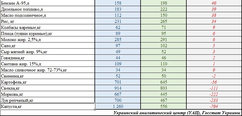 Показатель инфляции не всегда понятен и удобен для анализа. Поэтому лучше сравнить, сколько может купить украинец за свою среднюю заработную плату до и после повышения минимальной заработной платы. Вот это будет четкий ответ на вопрос: "Насколько на самом деле изменилась покупательная способность украинцев?" Для чистоты эксперимента из заработной платы вычтем подоходный налог физлиц и расходы физлиц на оплату услуг ЖКХ. Получились следующие результаты.