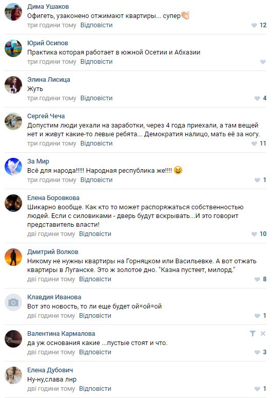 Реакция местных жителей в соцсетях на новость о готовящемся отжатии квартир возмущенная. Но теперь уже поздно негодовать. Думать нужно было раньше, когда бандиты звали вас на массовые митинги и референдумы, призывали крушить Украину и сеять анархию и хаос. Теперь ваше мнение уже никого не интересует. Вы заложники, а заложников не спрашивают ни о чем.