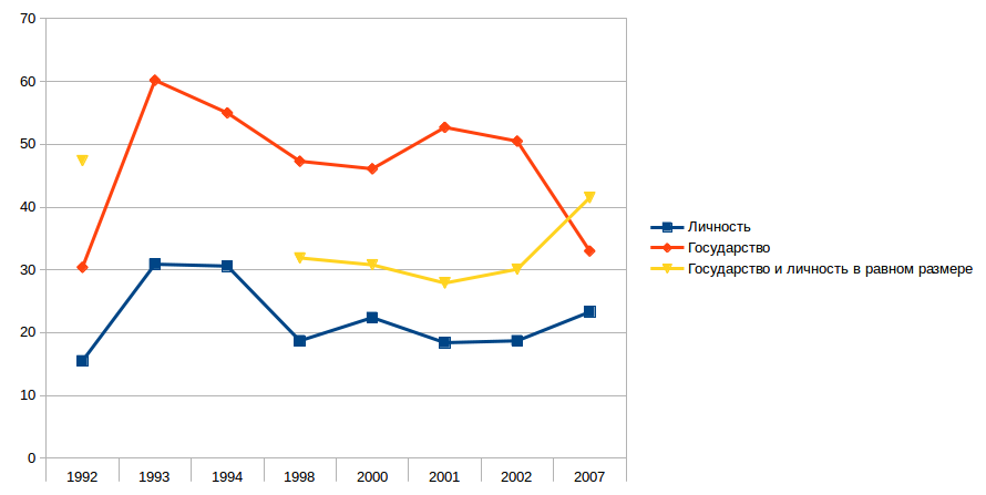 Уникальность сегодняшней ситуации в том, что в стране есть альтернатива и есть люди, которые могут эту альтернативу создать. Для этого приведу один график, который нарисовал на основании данных украинской социологии с 1993 по 2007 — ответ на вопрос «кто ответственен за качество жизни отдельной личности?»