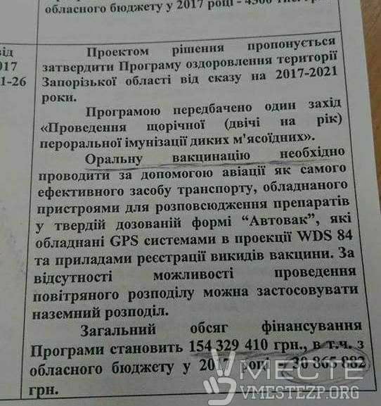 Уже в этом году хотят орально отвакцинировать лис на 31 миллион гривен. Кстати, по приблизительным подсчётам, согласно этой программе на вакцинацию одной лисы планируется потратить около 12 тыс. гривен. А может на оздоровление людей эти деньги лучше потратить, но не тех, которые собираются распилить бюджет, а на тех, которые живут в Запорожской области. Интересно, кто это придумал? Нужна вакцинация? Делайте. Но не смейте бюджетные деньги пилить! Меня сильно "порадовало" то, что в процессе оральной вакцинации лис планируют задействовать авиацию и спутниковую аппаратуру. А подключить какое-нибудь голливудское агенство для освещения данного события или аргументировать, что развозку вакцины надо производить исключительно на автомобилей марки Тесла не додумались вписать? Чего уж мелочиться?! Пилить деньги так пилить!