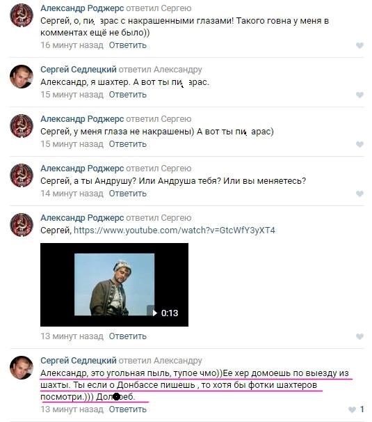 Российский пропагандист, "эксперт по Украине" Александр Роджерс, который регулярно выдает статьи о сокрушительных победах ЛДНР над Украиной, в комментариях к одному из своих постов обозвал "пидарасом" шахтера Сергея Седлецкого из Углегорска.