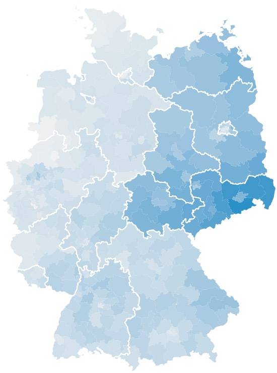 На второй (голубая) - результаты ультраправой пророссийской партии "Альтернатива для Германии", которые она получила на выборах в бундестаг. Чем больше голосов получила партия в регионе, тем темнее участок на карте.