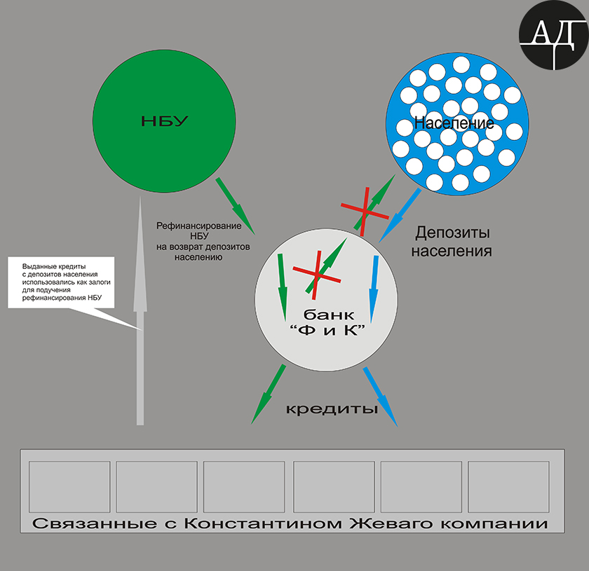 До момента объявления банкротства банка «ФиК» все жеваговские структуры свои кредиты в банке хоть и не возвращали, зато обслуживали, что и давало возможность использовать сам кредитный портфель - как залог для рефинансирования НБУ.