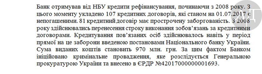 На момент введения временной администрации задолженность банка перед НБУ по этим кредитам составляла: