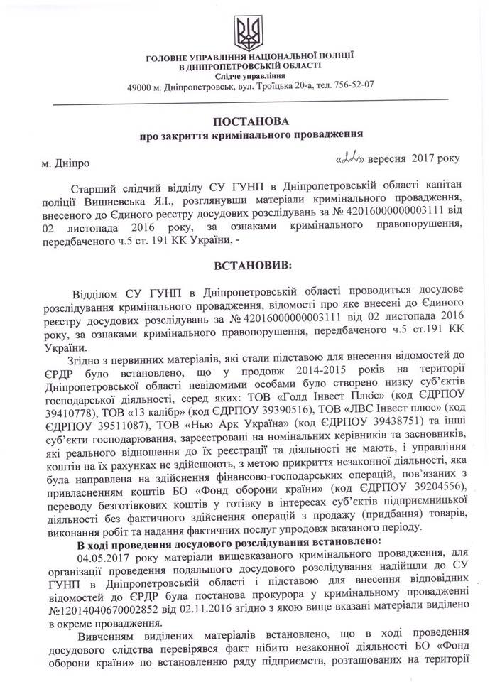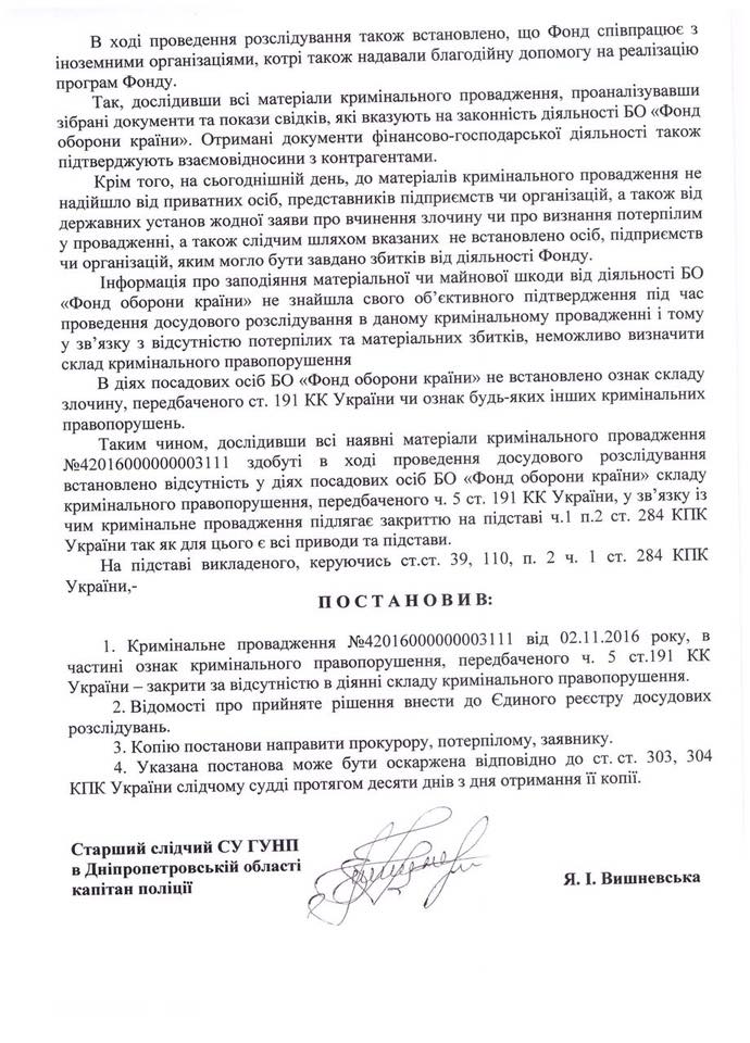 А вот ниже , я публикую постановление о закрытии уголовного дела, подтверждающее, что уголовное дело по Фонду обороны краины - закрыто. Орган-инициатор не только не нашел доказательств, а больше того - установил факты реабилитирующие деятельность фонда , и обозначил историческую значимость фонда обороны краины .