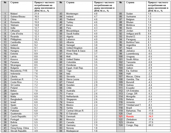 Из 124 стран мира, по которым есть соответствующие данные, частное потребление граждан на душу населения в 2014-16 гг. увеличилось в 97 странах, в том числе в 10 странах – более чем на 10%.