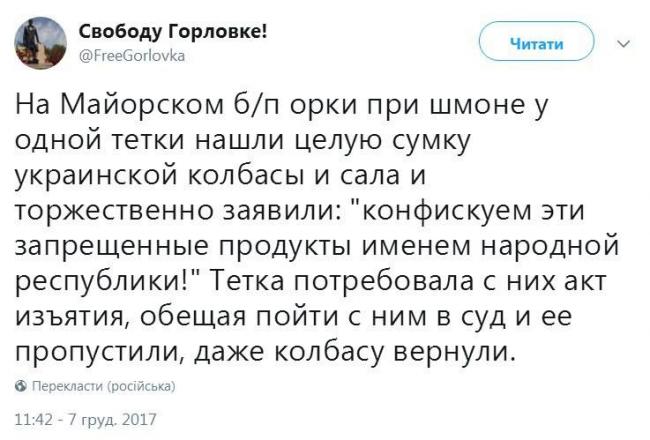 Я вообще о новогодних праздниках и подарках, не хочу о грустном. Ну, просто в ОРДЛО, чтобы купить эти самые новогодние подарки, сначала нужно съездить в Украину за пенсией. Дело это сложное, опасное. Кроме «хунты» и «фашистов» платящих навязчиво эту самую пенсию, пенсионерам предстоит встреча и с «освободителями»-опочленцами, которые так и норовят не навязчиво и заботливо отобрать пенсию, колбасу, сало, и другие «фашистские» зомбирующие и не скрепные продукты на КПВВ.