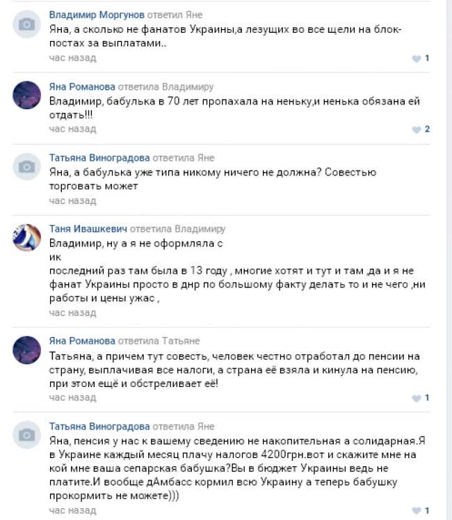 Большинство все же довольны. И ругают Украину за неудобства, причиненные не выплатой пенсии по адресу в ОРДЛО. На все замечания, и напоминания, что это «опочленцы» грабили банкоматы, банки, почту и почтальонов, «новороссы» отвечают пренебрежительно – «обязаны, платите, мы на вас всю жизнь пахали».