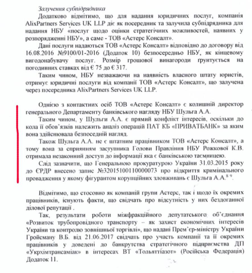 "Шульга А.А. не є штатним працівників ТОВ «Астерс Консалт», а тому вона за сприяння заступника голови правління НБУ Рожкової К.В. отримала незаконний доступ до інформації, яка є банківською таємницею".
