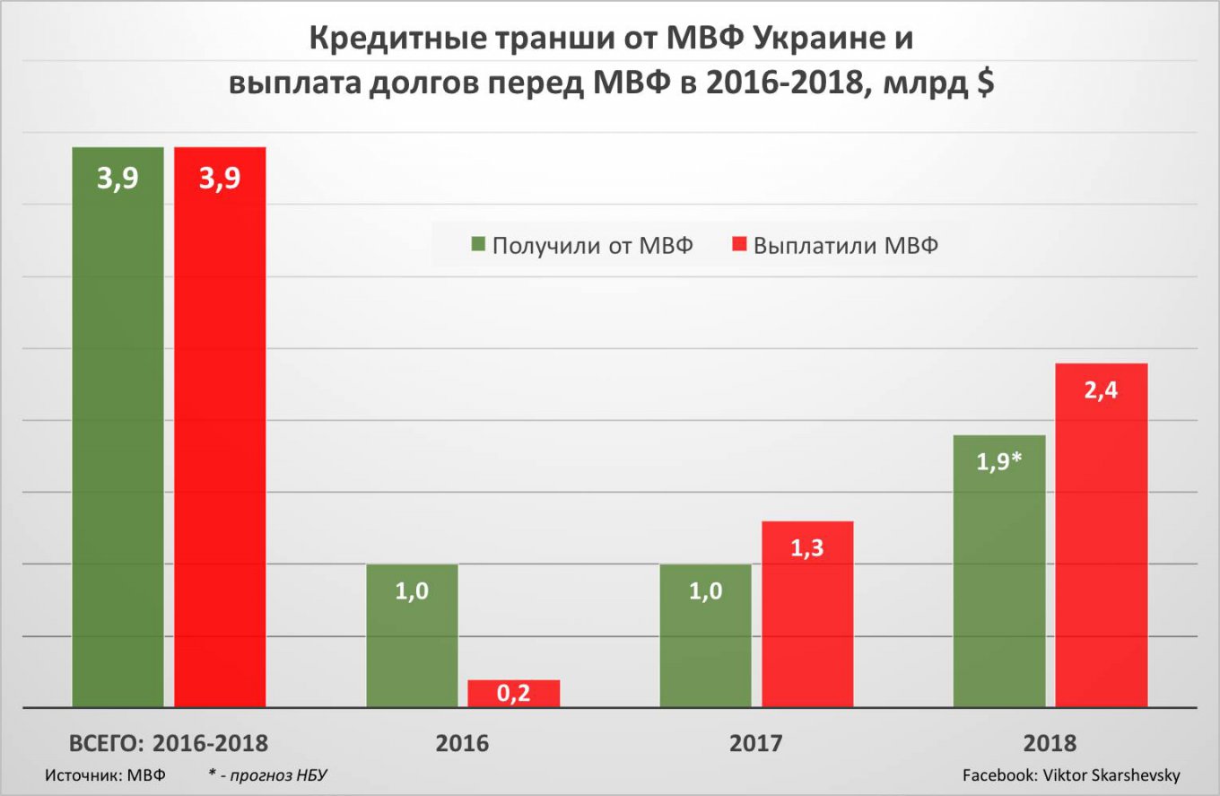 Если Украина в 2018 году таки получит широко разрекламированный Нацбанком, правительством и Президентом, транш от МВФ в сумме $1,9 млрд, то баланс сотрудничества Украины с МВФ в 2016-2018 годах будет выглядеть следующим образом: