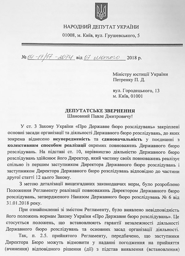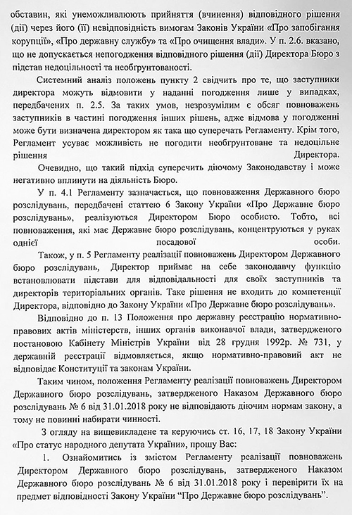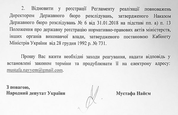 Я уже обратился к министру юстиции Павлу Петренко с требованием отказать в регистрации вышупомнутого Регламента, в связи с многочисленными нарушениями в его тексте закона Украины "О Государственном бюро расследований".