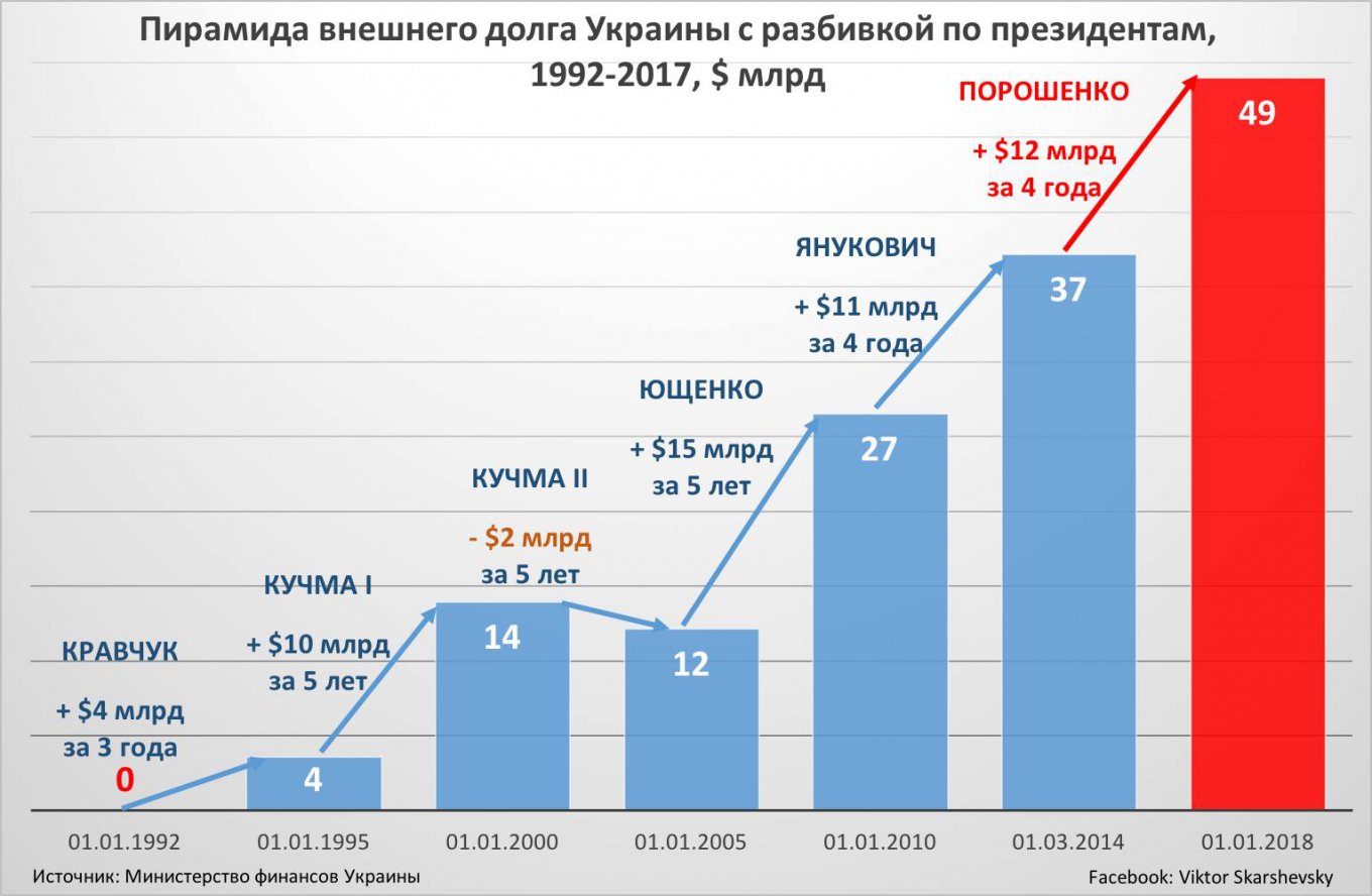 За наращивание внешних долгов каждый президент критикует предыдущего: Порошенко Януковича, Янукович - Ющенко, Ющенко - Кучму, Кучма - Кравчука. И только Леонид Макарович не имел возможности все свалить на предшественника.