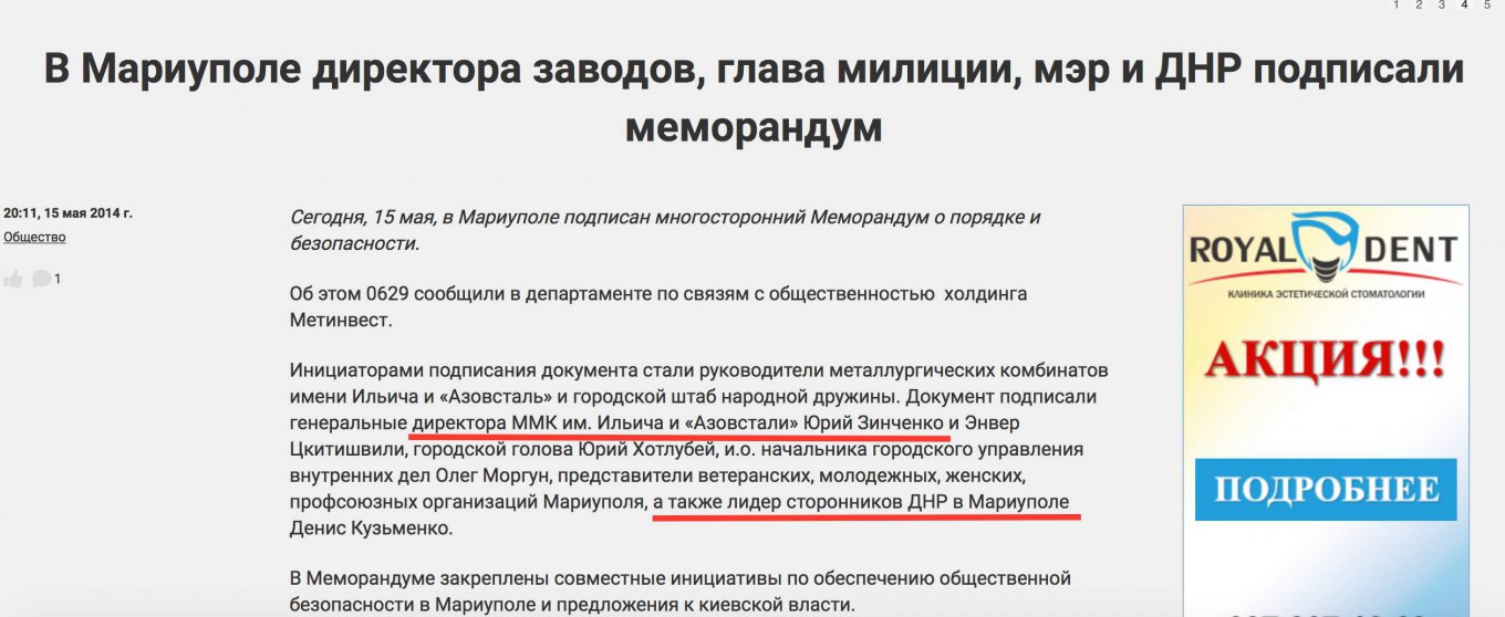Юрий Зинченко помимо прочего запомнился тем, что в мае 2014 года вместе с мэром города Хотлубеем и директором другого ахметовсктго комбината "Азовсталь" подписывал совместный меморандум с боевиками ДНР. В котором просил "киевскую власть" (то есть, как бы чужую, не мариупольскую) убрать от Мариуполя блокпосты ВСУ и передать контроль над въездами в город местной милиции. Напомню, что мариупольские менты в то время сотрудничали с сепаратистами и не мешали им устраивать в городе погромы и грабежи.