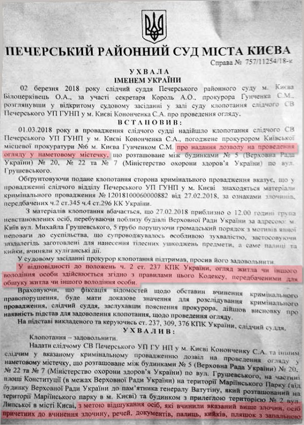 Во-первых, сам факт задержания людей в субботу не имел под собой никакого юридического обоснования. На фото решение суда, на основании которого действовали сотрудники НПУ в субботу под Верховной радой. Согласно документу, известный судья Белоцерковец дал следователям разрешение на осмотр помещения и другого имущества в палаточном городке с целью найти причастных к нападению на полицейских двумя днями ранее, а также предметов, которыми это было совершено.