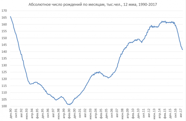 Если бы версия, предложенная Путиным, была верна, то сокращение рождаемости началось бы не в прошлом году, а еще в 2003–2004 годах. Однако этого тогда не произошло. Более того, поначалу рождаемость не падала, а даже росла. В целом же динамика рождаемости детей на трех временных отрезках этого 14-летнего периода (2003–2017 гг.) оказалась весьма различной.
