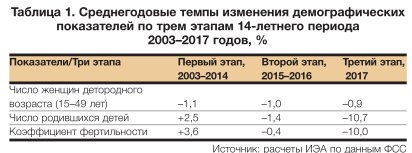 В течение первого этапа этого периода (11 лет, 2003–2014 гг.) число потенциальных матерей (в возрасте от 15 до 49 лет) уменьшилось на 11,5% (с 40,0 до 35,4 млн человек). Но число рожденных ими детей в то же время увеличилось на 31,3% (с 1483 тыс. в 2003 году до 1947 тыс. в 2014-м). Иными словами, в 2014 году меньшее число потенциальных матерей смогло родить заметно большее число детей, чем в 2003-м. Такая ситуация стала результатом роста почти в 1,5 раза коэффициента фертильности (общее число рожденных детей, деленное на общее число женщин детородного возраста) – с 37,0 до 55,0 детей на 1000 потенциальных матерей.