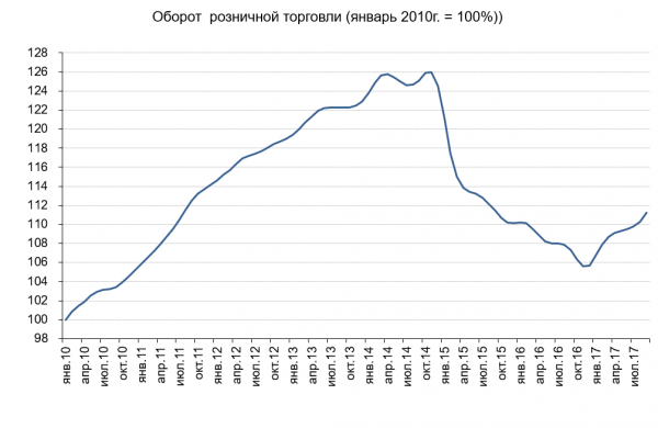 График 4. Оборот розничной торговли, сезонно и календарно выровненные данные (январь 2010 г. = 100%), 2010-2017 гг.