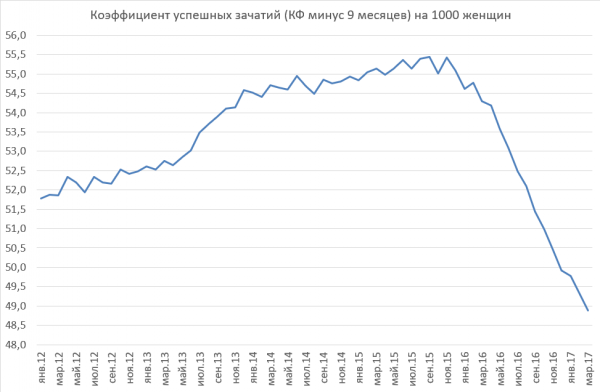 Нетрудно видеть, что такой точкой, а точнее – таким периодом – перелома выступает временной отрезок с августа по декабрь 2015-го. Именно в эти месяцы были достигнуты максимальные с 1989 года значения коэффициента успешных зачатий – более 55 успешных зачатий на 1000 женщин детородного возраста. С января 2016 года величина этого коэффициента начинает снижаться. К марту 2017-го его значение падает до уровня менее 49, то есть на 10% в год.