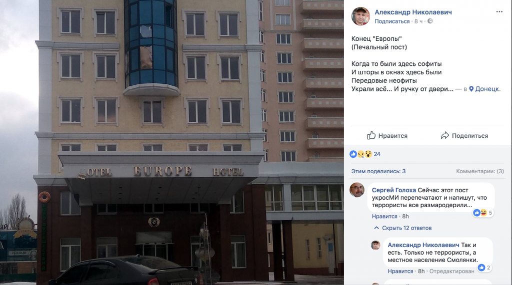 В комментариях к фото Болотин пишет, что гостиницу размародерили жители Смолянки, а не ДНРовцы. Может это и так, я не знаю. Но если бы не боевики со своей антинародной республикой, то никто гостиницу бы не тронул. Работала бы сегодня спокойно, как раньше. Упадок и мародерство — следствие захвата власти группировкой ДНР.