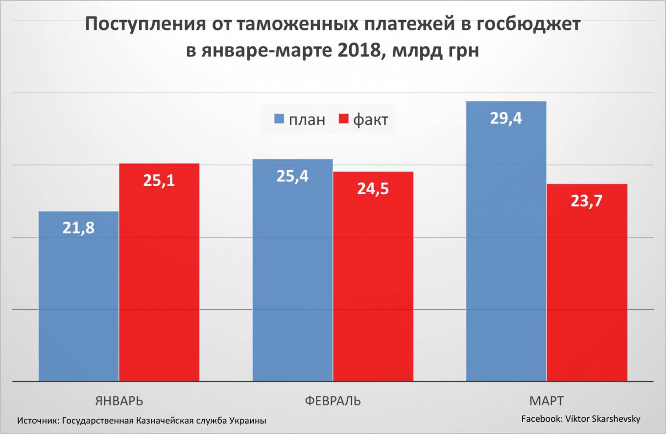 одна из причин провала по общим доходам госбюджета (минус 5,1 млрд грн) - это укрепление гривны в марте до 26,3 грн/$, что на 3 гривны ниже среднегодового обменного курса, заложенного в бюджете на 2018 год.