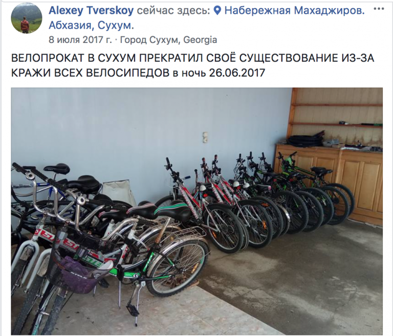 На своей фб-страничке Тверской пишет: «Велопрокат прекратил свое существование из-за кражи всех велосипедов»