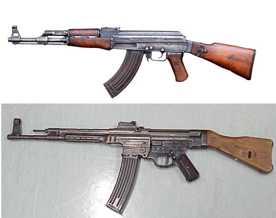 Другой пример — автомат Калашникова. На верхней картинке изображен АК, выпущенный в 1947 году (и принятый на вооружение СА в 1949-м), на нижней картинке — штурмгевер-44, известная также как "винтовка Шмайссера", выпущенная в 1944 году в количестве около 450.000 штук. Фанаты СССР не устают доказывать, что это мол "два принципально разных устройства", но по-моему, АК и штурмгевер-44 очень похожи.