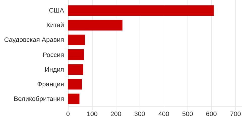 На диаграмме - страны с крупнейшими военными бюджетами (млрд долларов). Семерка стран с самыми большими военными расходами сильно изменилась с 2016 года. Саудовская Аравия поднялась с четвертого на третье место, Россия опустилась с третьего на четвертое, Индия поднялась на одну позицию, поменявшись местами с Францией, и только Великобритания осталась на седьмом месте.