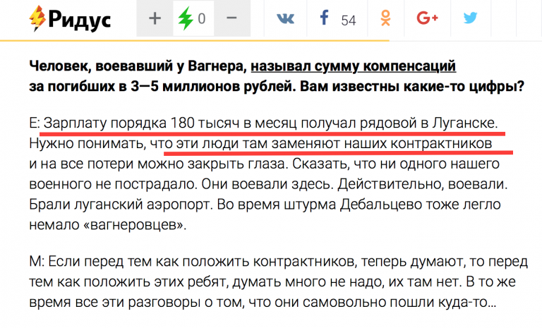 Тут же еще одно ключевое свидетельство — «эти люди там заменяют наших контрактников». Вот это и есть истинный механизм участия РФ в военном конфликте на Донбассе. Регулярную армию Кремль, очевидно, вынужден был применять только в нескольких решающих эпизодах, а в остальное время воюют такие вот «вагнеровцы», чтобы можно было не переживать по поводу потерь и не раскрывать их численность.